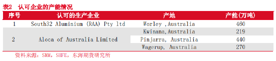 交易所认可的两家氧化铝厂的产能共计1389万吨,占澳大利亚总产能2124万吨的65.4%。认可企业的产能大小决定了其氧化铝可供出口量的大小,但可供出口量并不等于流向中国的进口量;进口量的大小取决于进口商与澳大利亚两家氧化铝厂签订的长单协议进口量、进口窗口打开的贸易进口量两个部分。