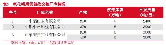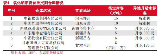 氧化铝交割品以生产地的价格为基准价,因此,交割厂库不存在异地升贴水。由于河南省铝土矿价格偏高,造成氧化铝的价格偏高、竞争力相对较弱,使得套期保值的需求也相对更强,因此,河南厂库的核定库容量相较于产能水平相对偏高。