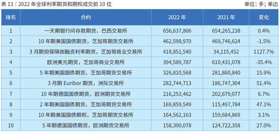 利率方面,巴西交易所一天期银行间存款期货成交增长0.4%,达到了6.57亿手,排名持续保持第1。芝加哥期货交易所10年期国债期货、5年期国债期货的成交量分别为4.63亿手和3.27 亿手,位列2022年全球利率期货和期权成交排行榜的第2和第5位;芝加哥商业交易所3月期担保隔夜融资利率、欧洲美元的成交量分别为4.19亿手、3.95亿手,位列成交排行榜的第3和第4位;芝加哥商业交易所3月期担保隔夜融资利率期货以1127.7%的增幅列涨幅榜首位。其他品种方面,中国内地商品交易所包揽了前10强,占前20强中的16席,较2021年增加2席,郑商所占8席,大商所占8席,较2021年分别持平和增加2席,大商所聚氯乙烯、线型低密度聚乙烯期权新晋入围。郑商所PTA、甲醇、纯碱、玻璃期货和PTA期权、短纤期货、甲醇期权、尿素期货分别位列第1、第2、第3、第5、第10、第11、第12和第13;大商所聚氯乙烯、聚丙烯、线型低密度聚乙烯、乙二醇、苯乙烯期货和聚氯乙烯、线型低密度聚乙烯、聚丙烯期权分别位列第4、第6、第7、第8、第9和第14、第15、第16。