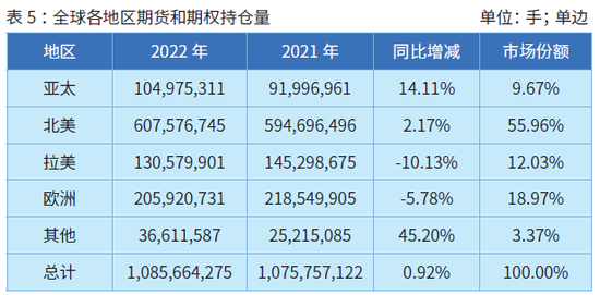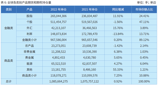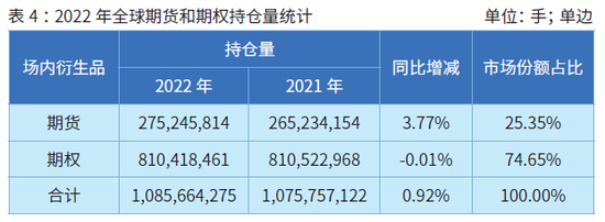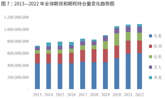 2022年年末,全球期货和期权的总持仓达到了创纪录的10.86亿手,较2021年年底的10.76亿手历史峰值增长了0.9%。