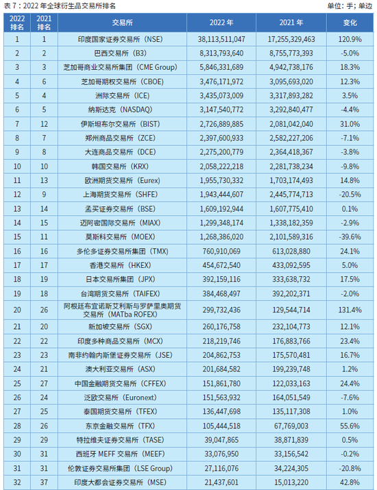 全球交易所成交量排名三甲与去年底相比没有变化,但前十强的位置出现了明显变化,印度国家证券交易所、阿根廷布宜诺斯艾利斯与罗萨里奥期货交易所(MATba ROFEX)、伊斯坦布尔交易所(BIST)成交均出现大幅增长。印度国家证券交易所、巴西交易所、芝加哥商业交易所集团分别以381.14亿手、83.14亿手、58.46亿手的成交位列前三,印度国家证券交易所以120.9%增幅呈现成交量遥遥领先的优势。按场内衍生品成交手数计算,2022年全球排名前3的交易所为印度国家证券交易所、巴西交易所和芝加哥商业交易所集团。其中,NSE连续四年超越CME集团和B3位居第1,成交量为381.14亿手,同比增长120.9%。这主要是受到其Bank Nifty和CNX Nifty股指期权成交大幅增加的推动,2022年Bank Nifty和CNX Nifty股指期权在全球场内金融类衍生品排名中分列第1和第2,增幅分别高达108.3%和148.7%,两产品成交占NSE总量的82.5%。巴西交易所借力其Bovespa迷你股指期货雄厚的成交基础持续超越CME集团保持第2,该股指期货占B3总成交的49.3%,B3总成交83.14亿手,较2021年下降了5.0%。受股指、外汇、利率及金属成交强劲增长推动,CME集团成交大幅上升18.3%至58.46亿手,排名第3,这是CME持续两年增长,一举扭转连续前两年成交量下滑趋势。芝加哥期权交易所(CBOE)成交量大增12.3%,达到34.76亿手,排名从去年的第6提升至第4。洲际交易所(ICE)成交量为34.35亿手,同比温和增长3.5%,排名从去年的第4下滑至第5。纳斯达克(NASDAQ)以31.48亿手成交名列第6,较2021年下降1位,成交量下降4.4%。伊斯坦布尔交易所以27.27亿手的成交,31.0%增幅位列第7,这是该交易所首次进入前十,较2021年排名大幅提升了5位。郑州商品交易所以23.98亿手的成交和7.1%的降幅排名降至第8,大商所和韩国交易所分别以22.75亿手、20.58亿手的成交位列第9和第10。上期所以19.43亿手的成交位列第12,排名下降了3位。