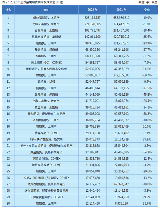 金属方面,中国内地商品交易所的品种持续包揽前7名,在前10强中占8席,较2021年减少1席,在20强中占14席,较2021年增加1席。上期所占10席,与2021年持平,不锈钢、锡期货新晋入围,大商所占2席,铁矿石期权新晋入围,郑商所占2席,与2021年持平。上期所的螺纹钢、白银、热轧卷板、铝、锌、镍、铜、黄金、不锈钢、锡期货分别位列第1、第3、第4、第5、第7、第10、第12、第15、第17、第18;大商所铁矿石期货和期权分别以2.21亿手和4171万手成交位列第2和第14;郑商所硅铁、锰硅期货分列第6和第13。