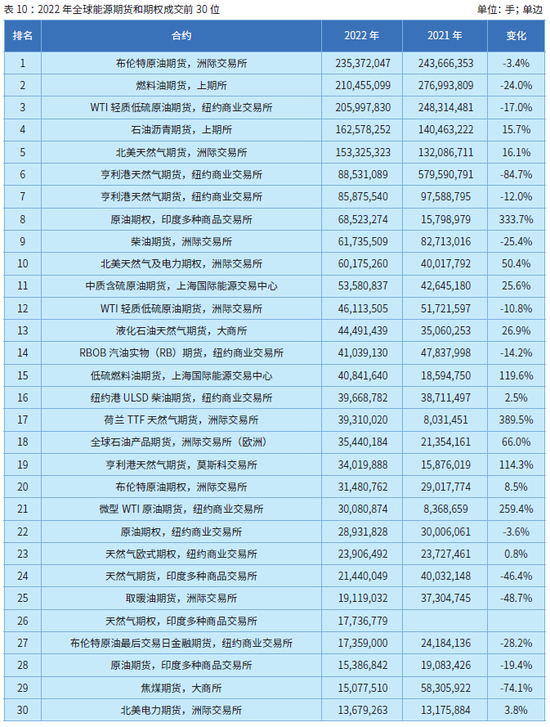 排名前20强中,洲际交易所的荷兰TTF天然气期货、印度多种商品交易所原油期权、上海国际能源交易中心的燃料油期货和莫斯科交易所的亨利港天然气期货分别以389.5%、333.7%、119.6%和114.3%增幅位列增幅榜前4位。