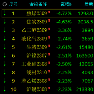 6月26日午盘收盘,国内期货主力合约多数下跌,焦煤、焦炭跌超4%,乙二醇(EG)跌超3%,液化气(LPG)、硅铁、工业硅、苯乙烯、沪镍、生猪、沪锡跌超2%。涨幅方面,尿素涨超3%,氧化铝涨超2%,燃料油、菜籽油涨超1%。