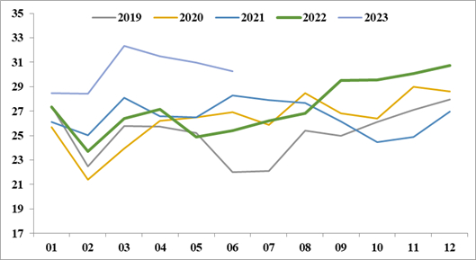 2023年,国产50%铅精矿加工费月度TC持稳在1000-1400元/金属吨之间波动。进口60%铅精矿月度加工费TC在60-80美元/干吨之间波动。进口铅矿数量持续偏紧,加工费用总体偏低。进口方面,进口窗口多数时间关闭,而沪伦比值走低的时间也长于走高的时间,影响了国内对于进口矿的采购,总体以采购国产矿为主。另外,2023年以来硫酸价格表现低迷,截至6月下旬,全国98%硫酸均价在160元附近,表现非常低迷。但白银价格显著回升,相对偏强。原生铅冶炼厂2023年有新增产能出现,而开工率保持在50%-70%之间。