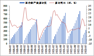 2023年5月,汽车产销分别完成233.3万辆和238.2万辆,环比分别增长9.4%和10.3%,同比分别增长21.1%和27.9%。2023年1-5月,汽车产销分别完成1068.7万辆和1061.7万辆,同比均增长11.1%。由于去年4-5月同期基数相对较低,累计产销增速较1-4月进一步扩大。