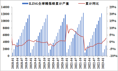 2022年,全球铅市产量1216.6万吨,同比降1.05%。 2023年1-3月全球铅市产量303万吨,同比约增2.71%。