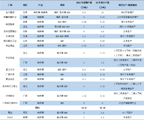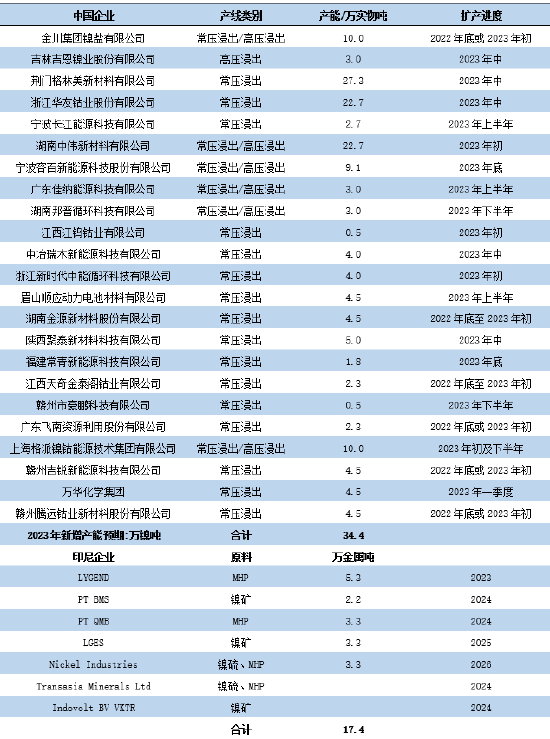 紧跟着青山电积镍投产,2023年国内新投或扩建电积镍产能达14.53万吨,仅在一季度就有已有两家企业新投,二季度另新增4家生产企业(2家新投、2家复产),原有生产企业亦将扩建,6月底国内精炼镍月运行产能已超2万吨;而下半年还将有4家工厂蓄势待发,年内开工精炼镍生产工厂将达到15家,届时月运行产能将超过2.6万吨,预计2023年国内新增电积镍产量超9万吨;另外青山与格林美在印尼有5万吨电积镍计划在6月投产。
