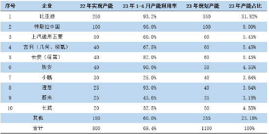 表格 1国内主要新能源车企产能及利用率(万辆)