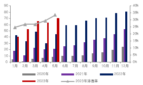 国内市场方面,2023年1-5月新能源汽车累计零售242万辆,同比增长41.1%,渗透率达31.7%;近期国家接连出台新能源汽车消费鼓励政策,叠加下半年车市进入旺季,需求预期有望继续回暖,但受制于一二线城市市场相对饱和、充电桩基础设施普及限制以及去年国补即将取消带来的高基数影响,乐观假设下全年销量有望达870万辆。欧洲市场方面,随着2023年供应链和芯片限制缓和,新能源汽车市场逐渐复苏,全年销量有望超290万辆。美国市场方面,2023年4月IRA法案细则发布,加之产业链及配套设施的逐步改善,全年销量有望达160万辆。同时国内车企加紧海外市场布局,1-5月国内出口量46万辆,占国内销量的15.6%,同比增长161.5%。预计2023年全球销量有望超1370万辆,同比增速27%,渗透率提升至16%。
