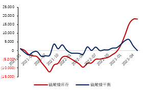5月新能源汽车产销量稳步回升,终端需求开始向上传导作用下,6月三元产业链需求有所恢复,对硫酸镍需求增加。现阶段新能源产业链去库接近尾声,加之下半年是汽车销售的旺季,国家支持扩大新能源汽车消费,下半年产业链排产有望逐渐恢复,但由于终端需求增速放缓、上半年产业链去库以及国内磷酸铁锂消费替代等原因,原料端镍需求全年增量不及预期。