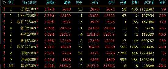 7月12日午盘收盘,国内期货主力合约多数上涨,尿素、工业硅涨近4%,液化石油气(LPG)涨超3%,棉纱、焦煤涨近3%。跌幅方面,鸡蛋、淀粉、生猪跌超1%。