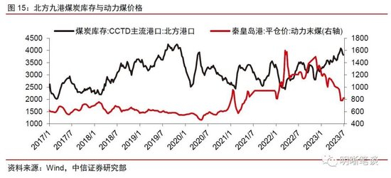 厄尔尼诺影响水热条件继而影响煤炭需求。火力发电仍是我国发电主体,去年火电占总发电量66.5%,水电为15.3%。在夏季出现的用电高峰需要发电功率调节更加主动的煤电补缺口。因此高温天气与煤炭需求量形成了正相关。2022年煤炭价格进入高位的重要原因是拉尼娜现象推动下的极端高温。一方面我国全境高温带来了居民用电需求的大幅抬升,另一方面南方高温伴随着罕见的干旱天气,导致水电利用率掉入历史低位。随着用电需求下降与今年年初西南、长江流域降水增长,径流恢复,水电供给正在抬升,这一煤价上涨的逻辑已不具备。