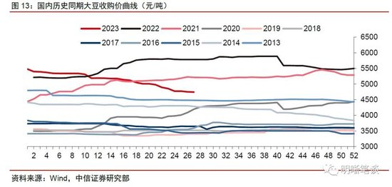 预计大豆价格延续趋势性回落。同样由于并非主粮,更依赖进口,历史上大豆价格也是波动较大,当前处在从过去两年的高位回落的趋势之中。我国大豆的生产端整体受厄尔尼诺的负面影响更不明确,种植面积更加重要。过去两年中大豆价格上涨与国际大豆价格走高相关。随着国际大豆库存与生产的预期走高,价格回落的趋势明确。目前国际大豆价格逐步下行,大豆进口增长快速,5月进口刷新单月记录,预计国内大豆价格回落的趋势仍将延续。