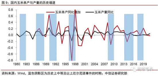 我国玉米的主产区在华北与东北地区,生产周期横跨夏秋季。其中华北大部分为和小麦套种,而东北则是单季作物。整体上看,玉米种植集中在华北、东北,雨热情况相似,单产波动偏大,但总产量同样较为稳定。从历史数据看,在厄尔尼诺年份中,我国玉米生产普遍受到负面影响,这是因为厄尔尼诺年中北方的干旱天气、东北冷涡的活跃不利于玉米生长。