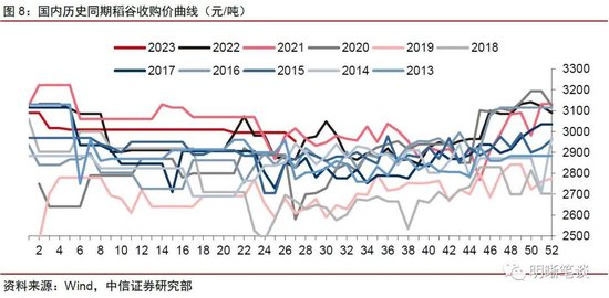 预计今年稻谷生产势头平稳,生产情况对价格影响可能不大。过去两年的水稻价格上涨主要受到国际原材料价格上涨带来的影响。虽有拉尼娜现象带来的南方极端天气影响,其中2022年我国南方出现了罕见的高温干旱天气,但水稻生产整体波动较小。由于水稻收获时间较为分散,整体受到旱情影响不大,甚至在2022年成为价格最低的主粮作物。截至目前,今年的稻谷价格走势与过去两年基本接近,仍然高于去年同期平均水平。基于气象部门对南方夏季天气的判断,今夏我国南方高温天气有望缓解,但降水增多,局部暴雨天气可能增多。对稻谷生产的具体情况仍难判断,相较于去年生产可能维持在相似水平。价格的决定性因素不在产量变动,而在市场需求情况。