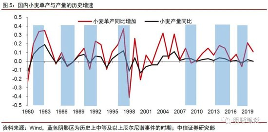 我国小麦生产主要集中在豫鲁皖冀苏等北方的黄淮流域,以冬小麦为绝对主导。厄尔尼诺影响下,紊乱的降雨节奏、干旱或暴雨天气都有可能让小麦生产面临各类灾害。从历史上小麦单产的变动情况来看,基本上每次中等及以上厄尔尼诺事件中或后期,都对应着小麦单产增速的下滑。总产量增速则基本遵循同样的变动规律,不过近些年来农村基础设施建设完善,防洪防汛措施逐步到位,总产量波动趋于平稳。