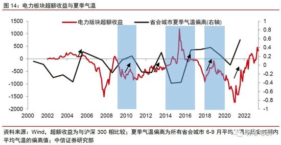 从历史上看,气温对电力市场有所影响。我国的电力需求端高峰在夏季,主要的驱动因素之一是高温天气带来的对制冷等各类需求抬升。夏季的高温天气也会触发各类保供电措施。电力的供给增长是长期过程,因此每轮夏季高温带来的需求增长都对应电力板块的较好表现。从下图可以看到,电力板块相对于沪深300的超额收益与夏季出现高温的时间点有一定相关性。
