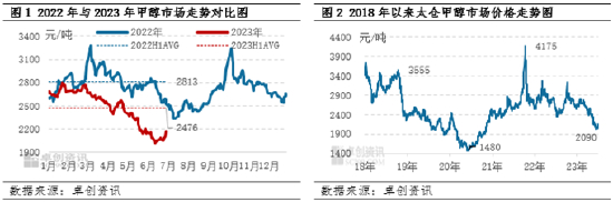 2023年上半年甲醇市场运行高点出现在1月末,价格达到2798元/吨。一方面国内外部分装置集中停车检修形成供应支撑,另一方面由于对经济复苏存偏强预期,市场参与者普遍心态乐观,贸易商持货意向较高形成需求支撑。随后春节后煤炭供应增加显著,煤炭延续回撤,甲醇成本支撑减弱,另外5-6月进口量连续增加,但下游需求未有同步增加,上半年供应相对过剩矛盾明显,加之欧美银行业危机使得原油宽幅下跌,导致包括甲醇主要下游聚烯烃产业链终端产品、房地产等在内的多数行业发展延续弱势,市场参与者心态谨慎偏空,甲醇价格承压下行,不断刷新年内低点。截至6月12日,太仓甲醇市场价格收于2023元/吨,创造年内低点的同时刷新了2020年6月初的低点。