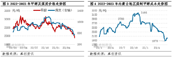 2023年国内动力煤市场整体以持续下行为主,且跌幅较大。一方面,国内煤矿多继续落实增产保供政策,主产区煤矿多生产稳定,产量整体稳中有增,据国家统计局数据,2023年1-5月份,全国生产原煤19.1亿吨,同比增长4.8%;同时港口煤炭库存保持在历史高位水平,且进口煤阶段性性价比突出,进口煤数量增加明显,对国内供应形成有效补充。另一方面,需求表现偏弱,跟进不足,电力行业耗煤需求虽有增长,但整体幅度不大,且长协资源充足,对市场煤需求有限;而非电行业则受利润表现持续欠佳影响,控制煤炭采购节奏,难以对现货市场形成支撑。截至6月30日,国内煤制甲醇成本为2000元/吨,较去年同期下跌23.37%,较年初下跌24.98%,成本端持续松动,一定程度上导致市场心态发生变化,成本支撑减弱后,卖方低价让利排货较多,因此成交价格随之下移。