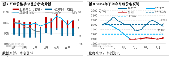 整体来看,美联储加息步伐有所放缓,国际原油的价格中枢在下半年有望有所上移,但基于全球经济增速放缓以及亚洲国家经济复苏支撑弱化的影响,油价上涨的幅度受限,WTI大概率在70-80美元/桶之间运行。从供需方面来看,受国内经济持续修复提振,叠加“金九银十”传统消费旺季加持,下半年甲醇需求或将有所回升。考虑到甲醇价格上涨后,下游盈利性或将被动削弱,需求回升的稳定性或将难以持续。从库存周期的角度来看,2023年上半年煤炭价格松动,导致甲醇及下游处于主动去库过程,考虑到下半年原料成本或维持震荡有升的格局下,甲醇及下游库存或将维持震荡有升格局,整体库存压力不大。综合上述分析,卓创资讯延续《2022-2023中国甲醇市场年度报告》中关于下半年的趋势预测,下半年价格有望修复反弹,9月份前后有望出现阶段性高点。太仓地区主流价格运行区间或在2090-2140元/吨,根据季节性规律判断,下半年的高点大概率出现在9、12月份,低点或出现在7、11月份(具体价格预测参考图8)。