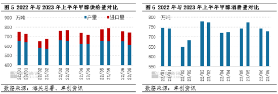 供应增量方面,当前甲醇仍处于扩能周期,2023年上半年先后有7套装置投产,总计新增产能达到455万吨,因部分装置调试运行周期较长叠加部分其他突发因素干扰,年内实际开工时间较短,对产量贡献度偏低。存量方面,上半年内,甲醇行业亏损较普遍,企业生产积极性一般,加之计划外检修较多,导致上半年装置实际利用率略低于去年同期水平,产量也有所下降。据卓创资讯数据统计,2023年上半年,甲醇行业平均开工负荷67.33%,较去年同期下跌4.58个百分点,1-6月份国内产量在3762万吨,较去年同期减少1.90%。