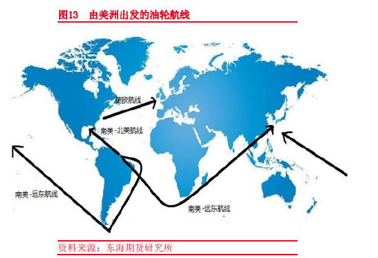 从南美出发的原油运输航线主要前往东亚、北美,从而形成南美-远东航线,南美-北美航线;而美国出口至欧洲的原油,形成了美欧航线。