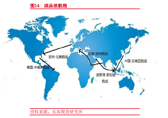 从原油主产区处罚的航线主要包括:由中东产油国出口成品油至集散地新加坡,形成波斯湾-新加坡航线;由美国出口成品油至中南美洲国家,形成美国-中南美洲航线。