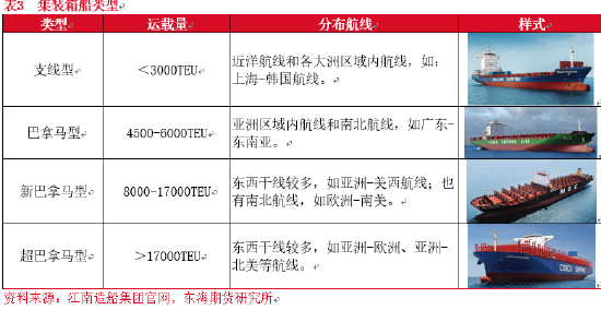 根据集装箱船的载重量大小,集装箱船可以分为四个类别:支线型、巴拿马型、新巴拿马型、超巴拿马型,主要运载量和分布的航线如下: