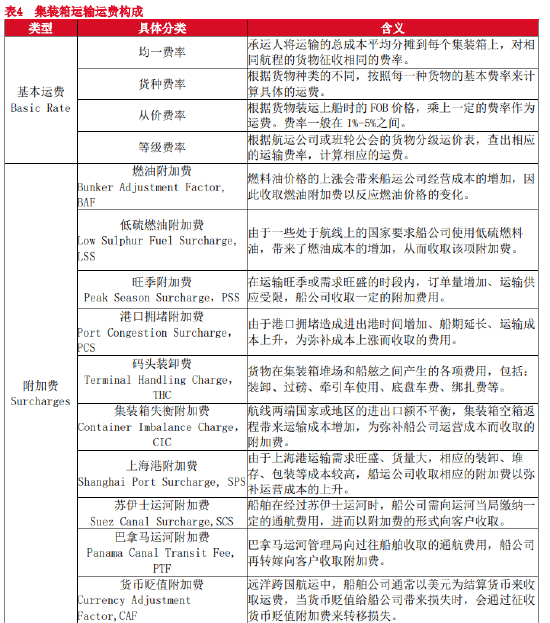 集装箱船的运输为班轮定期运输,航线、港口、船期、费率均较为固定;集装箱运输的运价由两部分构成:(1)基本运费,大致可分为均一费率、货种费率、从价费率、等级费率四种,对于大部分集装箱适用均一费率;(2)附加费,主要针对各类影响运价高低的可变因素收取费用,如燃油、港口拥堵、码头装卸、淡旺季等因素,以弥补船公司各项开支增加带来的运营成本增加。