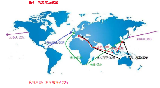 煤炭发运航线:煤炭的出口国包括澳大利亚、印尼、南非、哥伦比亚、加拿大等,主要的进口国为中、日等远东国家以及欧洲国家,相应的航线如下图所示。