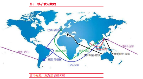 铁矿发运航线:铁矿的出口国包括澳大利亚、巴西、南美、智利,主要的进口国为中、日、韩等远东国家以及欧洲国家,相应的航线如下图所示。