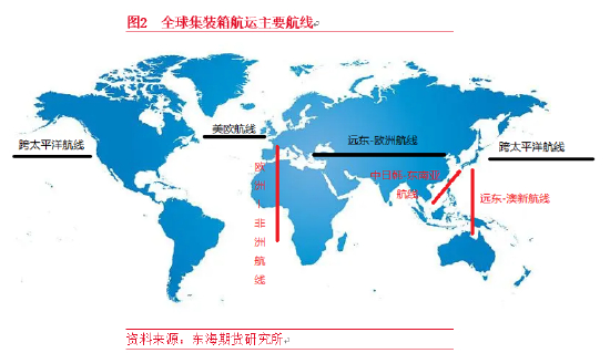 全球集装箱航线主要包括东西航线、南北航线、洲内航线。其中,东西航线为主干航线,包括跨太平洋航线、远东-欧洲航线、美欧航线;南北航线包括欧洲-非洲航线、远东-澳新航线;洲内航线指洲际内部的航线,最具代表性的是远东区域内航线,即中日韩-东南亚航线。