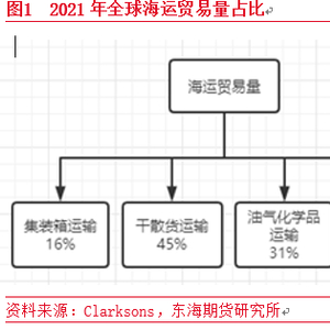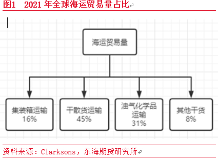 根据商品种类、性质的不同,海运所需的船舶也存在不同;根据船舶的不同,海运市场可主要分为集装箱航运市场、干散货航运市场、油气航运市场三大类。从贸易量来看,集装箱运输的占比在三大类市场中居于末位;但使用集装箱运输的多为高货值的制成品或半成品,而干散货航运、油气航运的则为原料、能源品,使得集装箱航运的运输总金额居于三者之首。