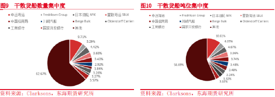 Ø 干散货航运。根据运载量的不同,干散货船分为灵便型、巴拿马型、好望角型、超大型四个类别;干散货运输的物品主要为铁矿、煤炭等大宗干散货,根据各个品种出口国、进口国的不同,分别形成了相应的航线。干散货运输以租船运输为主,租赁方式包括程租、期租、光租,相应的收费方式也不同;干散货运价指数方面,主要参考的国外指数为BDI,国内则包括远东干散货指数、中国进出干散货运价指数等。干散货航运市场的前十大公司的船舶数量、载重吨分别占到市场的37.3%、43.3%。