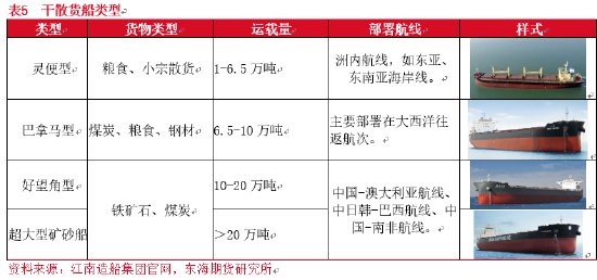 根据干散货船的载重量大小,船型可以分为四个类别:灵便型、巴拿马型、好望角型、超大型矿砂船,主要货物类型、运载量和分布的航线如下: