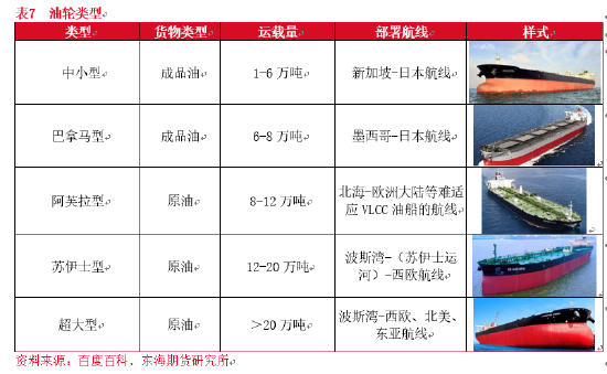 根据运输货物、载重量大小的不同,油轮可大致分为两大类五个小类别:运输成品油的包括中小型、巴拿马型油轮;运输原油的包括阿芙拉型、苏伊士型、超大型油轮。主要货物类型、运载量和分布航线如下: