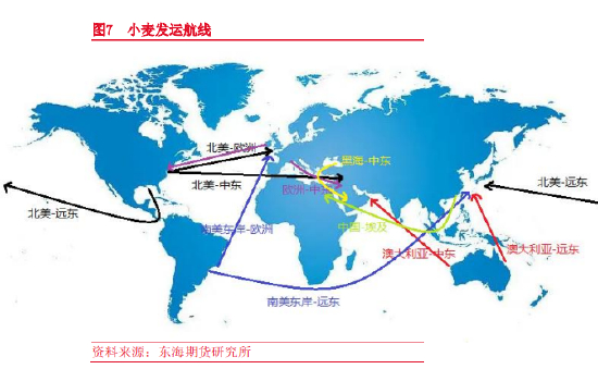 小麦发运航线:小麦的出口国包括美国、巴西、阿根廷、澳大利亚、俄罗斯、中国等,主要的进口国包括远东国家、欧洲国家、非洲国家等,相应的航线如下图所示。