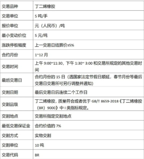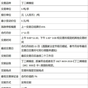 丁二烯橡胶期货合约的交易单位为每手5吨,交割单位为每一标准仓单10吨。最小变动价位为5元/吨,交易保证金为合约价值的12%;涨跌停板幅度为±10%,首日涨跌停板幅度为其2倍。交易手续费为成交金额的万分之零点一,平今仓交易暂免收交易手续费。