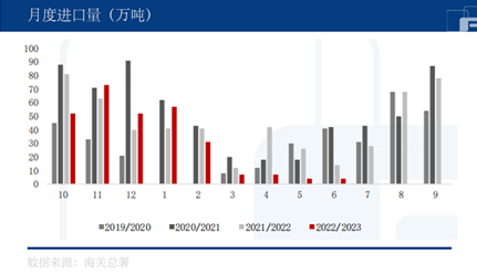 截至目前,新季我国累计进口糖287万吨,同比下降73万吨。进口糖到港开始边际递减。巴西航运机构 Wiiams 显示,当周,巴西港口等待装运食糖的船只数量为 69 艘,此前一周为 82 艘。