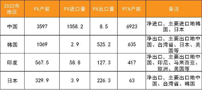 亚洲来看,中国是最大的净进口地区,其次是中国台湾、印尼;PX出口主要集中在韩国、日本、印度、文莱、新加坡。