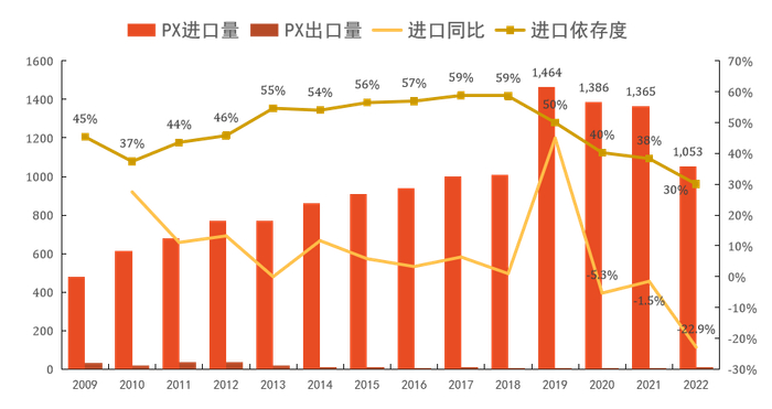 中国是PX净进口国家,截止2022年PX中国进口量1053万吨,进口量和进口依存度从19年起逐年下降。截止23年PX进口依存度已从高点59%下降至30%左右。随着国内产能投产加速,进口依存度有望继续下移。