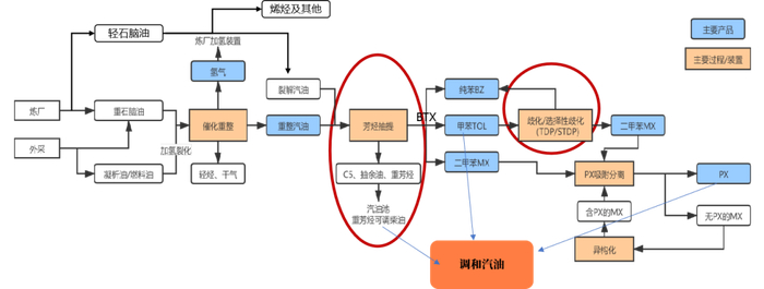 石脑油制PX装置又称为芳烃联合装置,石脑油分离出轻石脑和重石脑,其中轻石脑油裂解制裂解汽油,然后芳烃抽提,其中的混二甲苯再经过吸附分离获得PX;重石脑通过重整、抽提获得纯苯、甲苯、C9、混二甲苯、汽油等,甲苯和C9可以通过歧化货选择性歧化得到纯苯和混二甲苯,混二甲苯通过吸附分离和异构化得到对二甲苯。(大部分一体化为主,丽冬、福佳、富海部分外购石脑油)