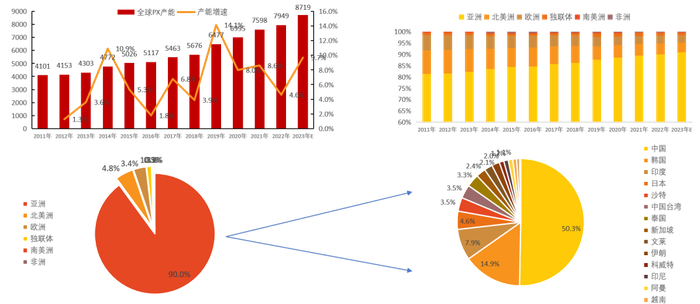 亚洲主要的产能集中在东北亚,按产能来看,全球PX前五大产能地区位于中国、韩国、印度、日本和美国。