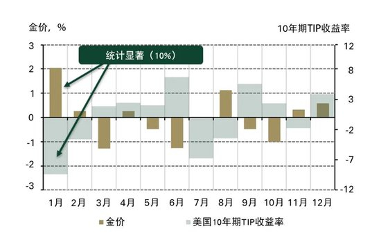 1月强劲的黄金表现也与美国通胀保值国债(TIPS)收益率的季节性强势相吻合(图2),这背后的驱动可能是投资组合再平衡、对通胀对冲的调整,或仅仅是对收益率疲软预期的反应等因素,都有助于推动年初黄金回报率涨至平均线以上[6]。