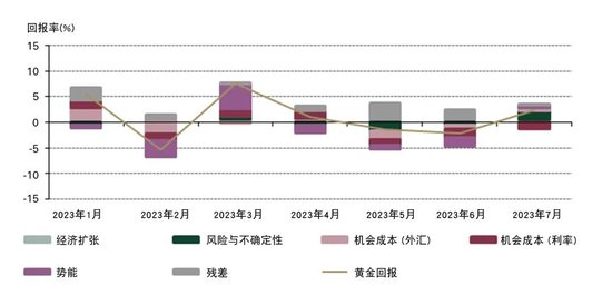 *数据截至2023年7月31日。我们的短期金价表现归因模型(GRAM)[4]是有关金价月度回报的多元回归模型,其中包括四类关键的金价表现驱动因素:经济扩张、风险与不确定性、机会成本和势能,这些驱动因素的相关主题反映了黄金需求背后的动机,更为重要的是投资需求背后的动机。这些被认为是短期内黄金价格回报的边际驱动因素。“残差”包含了目前模型尚未捕捉到的其他因素。此处结果是基于2007年2月至2023年7月的分析。
