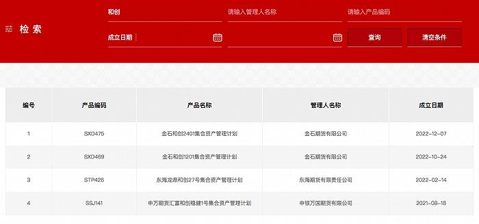 中基协网站显示,以期货公司集合资管产品为例,有4只名字中带有“和创”二字的备案产品正在运营中,分别是金石和创2401集合资产管理计划、金石和创1201集合资产管理计划、东海龙鼎和创27号集合资产管理计划和申万期货汇富和创稳健1号集合资产管理计划,管理人分别为金石期货有限公司、东海期货有限责任公司和申银万国期货有限公司。