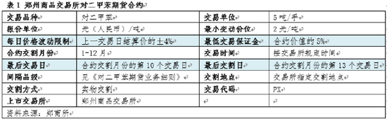 根据征求意见稿,对二甲苯期货合约交易代码为PX,交易单位为5吨/手,最小变动价位为2元/吨,每日价格波动限制为上一交易日结算价的±4%,最低交易保证金为合约价值的5%,合约月份为1-12月,最后交易日和最后交割日分别为合约月份第10个交易日和第13个交易日。其余详细信息见表1所示。