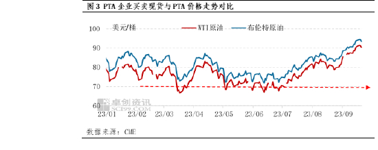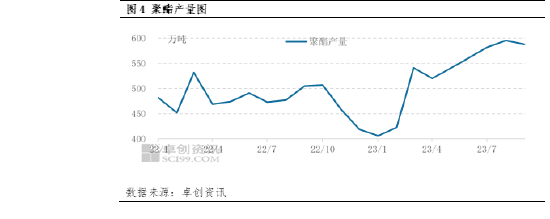 三季度PTA行情上涨的主因是成本上涨:原油价格涨至11个月内高点,PX价格涨至14个月内高点,辅料醋酸价格涨至15个月内高点。原油上涨的主因是美联储加息放缓且主要产油国减产,近三年内原油数次跌至70美元/桶均出现反弹行情,三季度主要产油国官宣延长减产时间,原油价格震荡上涨完全站稳70美元/桶的阶段底部。PX上涨的主因是PTA新产能持续投产且PTA月产量创历史新高,PX需求较好导致近月存在去库存预期,PX货源呈现近强远弱的格局,PX美金价格震荡上涨叠加人民币汇率贬值,折算PTA成本上升。三季度辅料醋酸价格明显上涨,由于部分醋酸生产企业计划外减产但刚需偏好,导致醋酸库存持续下降,9月醋酸生产企业整体厂内库存为年内最低水平,较1月库存高点下降约14万吨,醋酸实际流通量偏少,推涨醋酸价格,间接增加PTA成本。