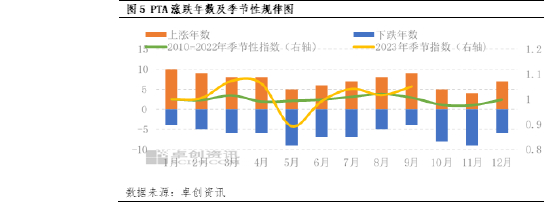 按2010-2022年PTA现货价格数据来看,四季度PTA行情下跌的概率较大。历史数据显示,10-12月PTA季节性规律指数分别为0.98、0.98、1,整体处于一年内下跌概率最大的季节。按2010-2022年三季度PTA现货价格涨跌年份的数量来看,2010-2022年PTA现货价格在10-12月下跌的年份分别为8年、9年、6年,下跌年份占比分别在62%、69%、46%,换言之,2010-2022年10-11月现货月均价下跌为主,而12月PTA现货月均价止跌反弹为主。